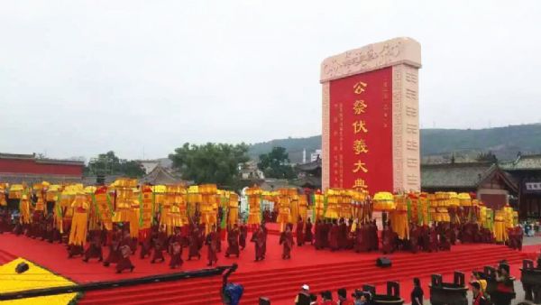 6月22日上午,由國務(wù)院港澳事務(wù)辦公室、國務(wù)院臺灣事務(wù)辦公室、中國僑聯(lián)和甘肅省人民政府主辦,甘肅省文化廳、天水市人民政府承辦的2015(乙未)年公祭中華人文始祖伏羲大典在天水市伏羲廣場隆重舉行。全國政協(xié)副主席馬飚宣布公祭伏羲大典開始。中國國民黨榮譽副主席蔣孝嚴、甘肅省人民政府省長劉偉平、甘肅省政協(xié)主席馮健身等出席。此次大典的主題為“同根同祖 中華共祭”,海內(nèi)外華夏兒女匯聚羲皇故里,感懷伏羲功績、傳承中華文明,表達對伏羲的虔誠敬仰。
