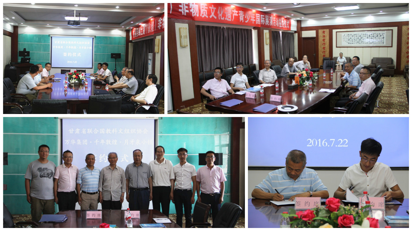 7月22日下午3時30分,甘肅省聯(lián)合國教科文組織協(xié)會杜永軍會長與甘肅萬華實業(yè)集團總經(jīng)理、敦煌千年古城開發(fā)有限公司董事長牛新偉,在萬華集團三樓會議室就“首屆絲綢之路(敦煌)非物質(zhì)文化遺產(chǎn)青少年國際展演活動”合作事宜正式簽約。甘肅省人民政府原副秘書長、協(xié)會總顧問于忠正,甘肅省教育廳原副廳長、協(xié)會終身榮譽會長馬培芳等領(lǐng)導(dǎo)出席并見證了簽約儀式。