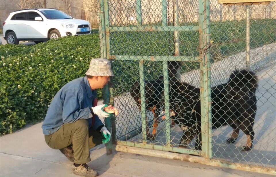 正說(shuō)著,代初春看了看時(shí)間——到點(diǎn)兒了!他顧不上多說(shuō),趕緊去食堂備取了幾塊雞架去喂狗,前院的“大虎”和“尕虎”老遠(yuǎn)看見(jiàn)他的身影搖著尾巴歡快地跳著。代初春熟練地把雞架分給它們,然后又去給后院的“虎子”喂食。