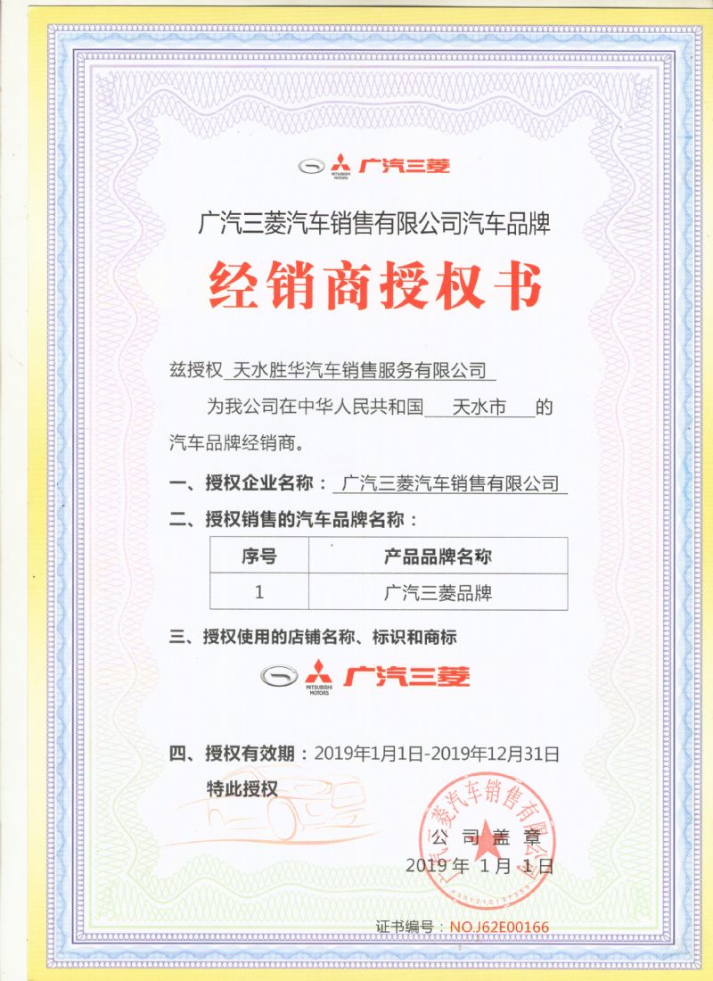 廣汽三菱經(jīng)銷授權(quán)書