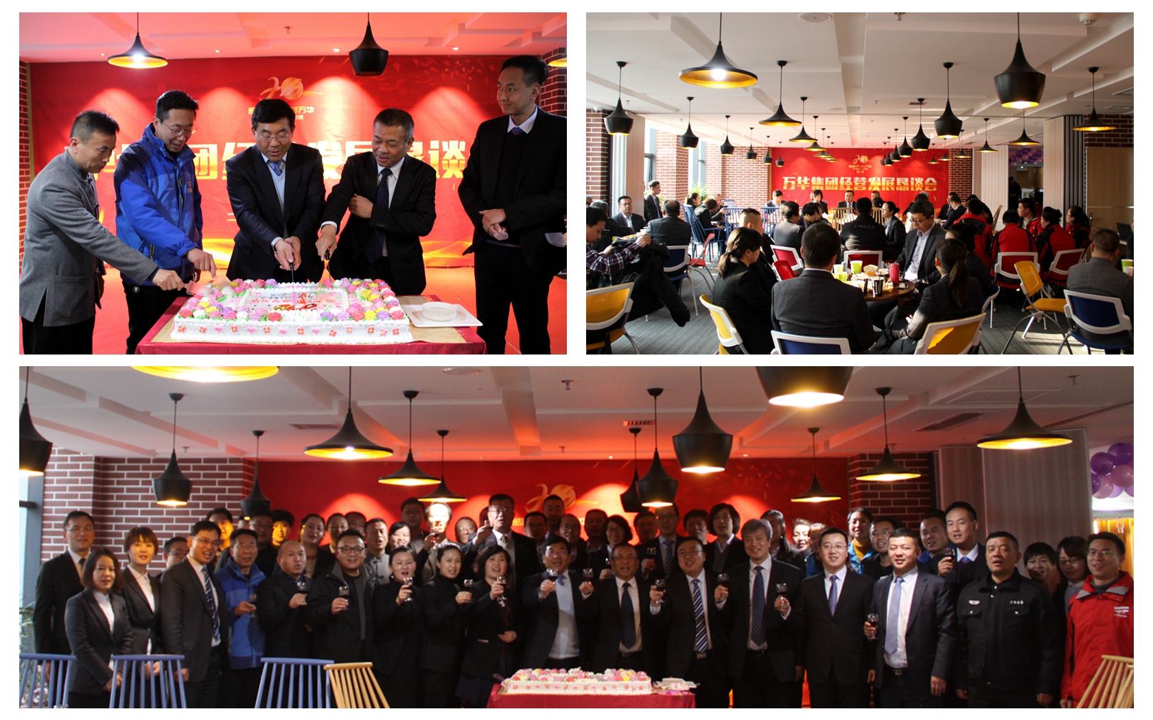 懇談會結束后,董事長牛新民和總經理牛新偉與萬華集團各業(yè)務板塊老員工代表一同切蛋糕為萬華20歲生日慶生。