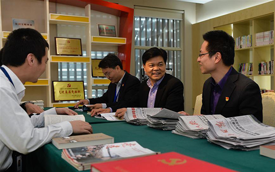 在亨通集團(tuán)黨員服務(wù)中心閱覽室,崔根良(右二)和黨員們一起學(xué)習(xí)交流。 新華社記者 季春鵬攝