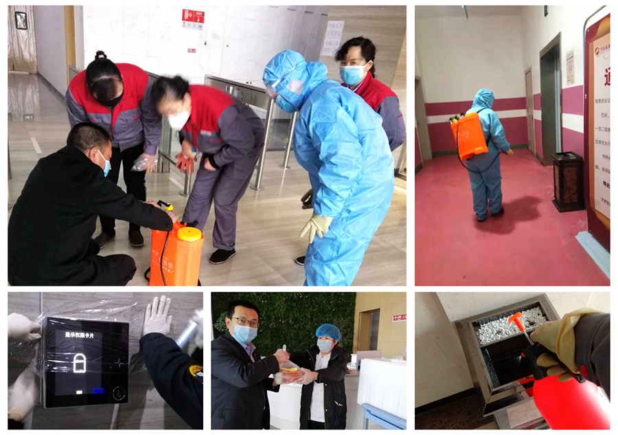 1月28日,防疫工作開始有條不紊地展開:工程部關閉大廈空調(diào)系統(tǒng),關停二維碼訪客系統(tǒng)和大廈貨梯以及負一、負二層客梯,有效地管控了人員出入;綜合部聯(lián)系印制防疫宣傳展架,禁止未佩戴口罩人員進入大廈,營造了嚴肅的防疫氛圍;客服部安排保潔每日對大廈所有衛(wèi)生間、垃圾桶、電梯、門把手及各樓層公共區(qū)域按時按要求進行消殺工作。
